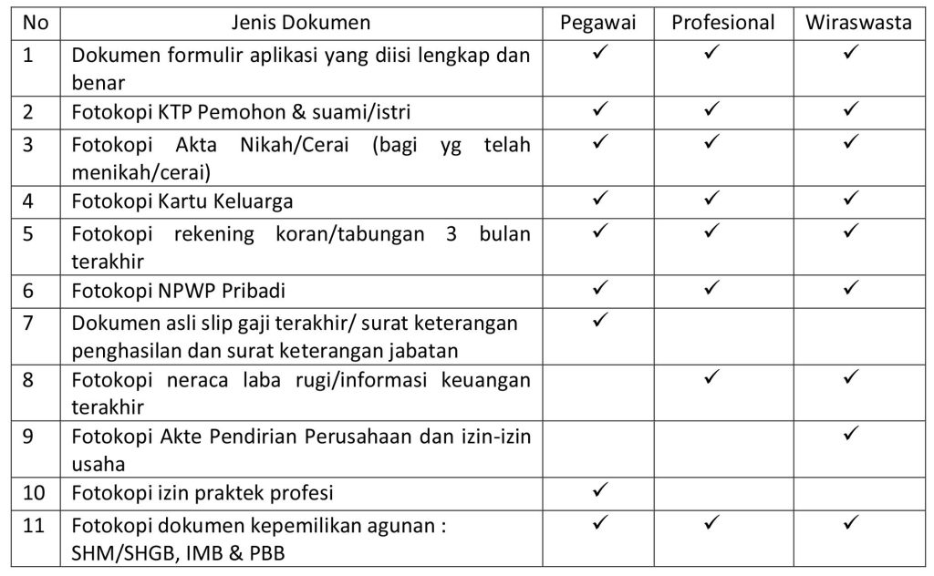Memiliki pekerjaan dan penghasilan tetap, dengan masa kerja/usaha minimal 1 (satu) tahun (pegawai) atau 2 (dua) tahun (profesional/wiraswasta)